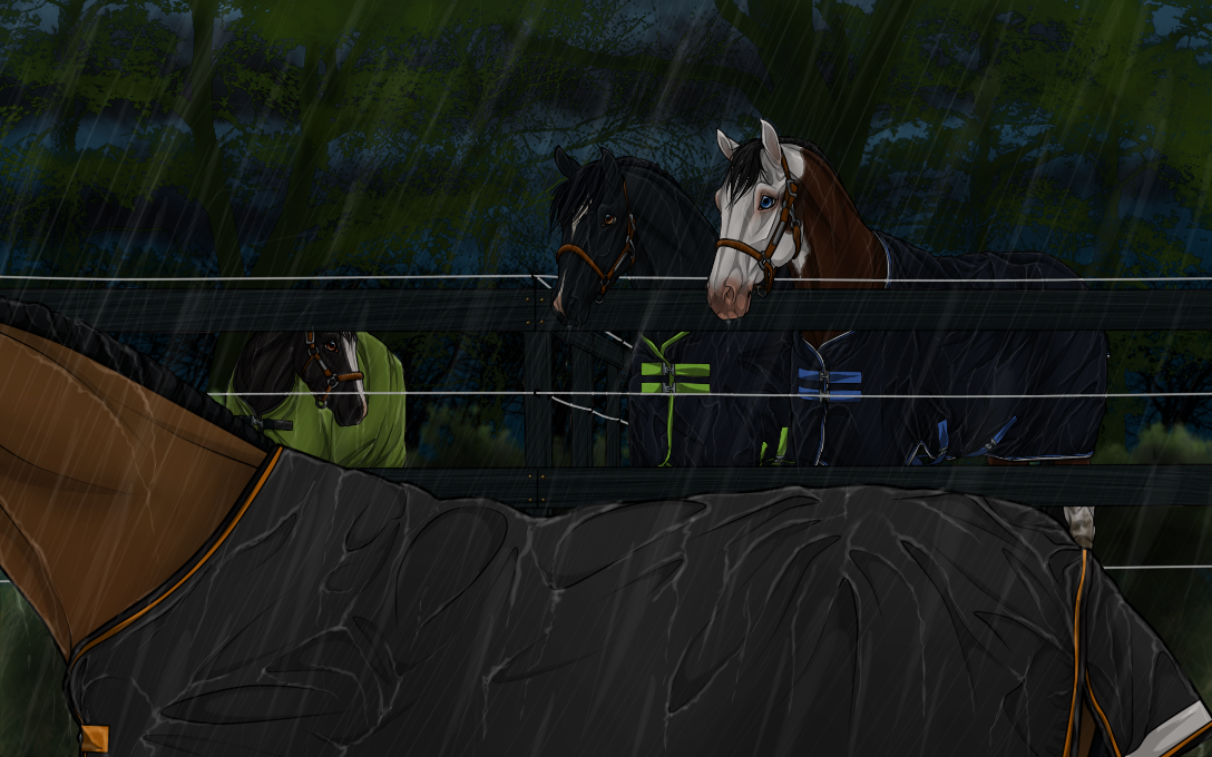 Hestene venter spændt på at komme ind fra den silende regn i