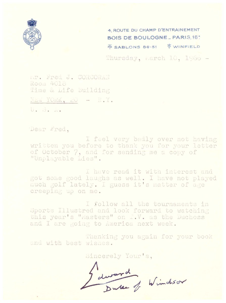 #KingEdwardVIII, from Paris to "Mr. Golf" Fred Corcoran in NY
