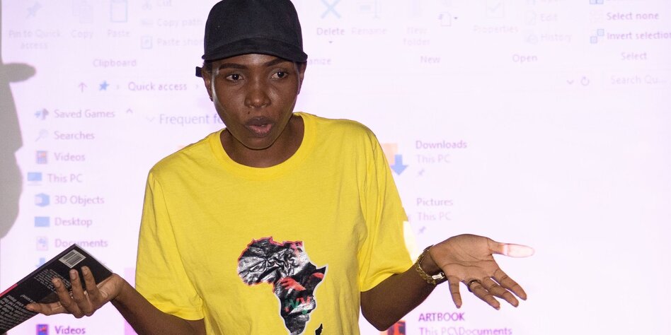 und heute in Lagos lebt. Sie trägt schwarze Jeans und ein knallgelbes