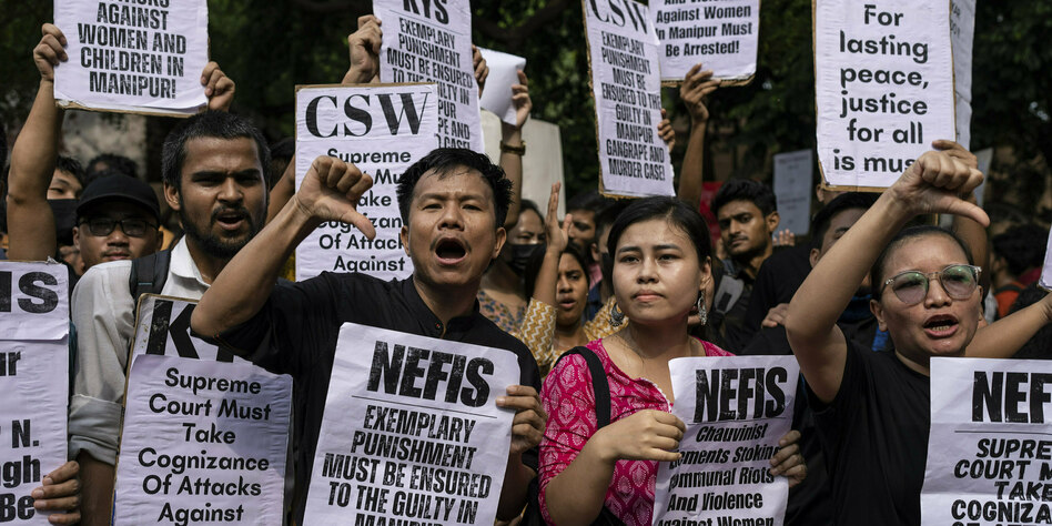 IMG Bild: Student:innen und Aktivist:innen in Neu-Delhi demonstrieren gegen die ethnische Gewalt in Manipur