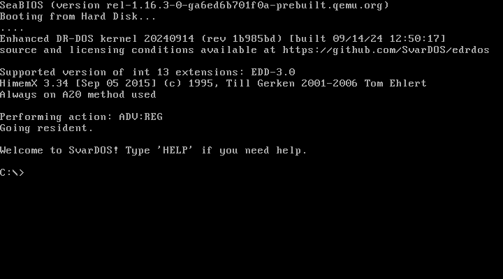 SvarDOS in qemu and dosbox-x running on Slackware64 15.0. I am